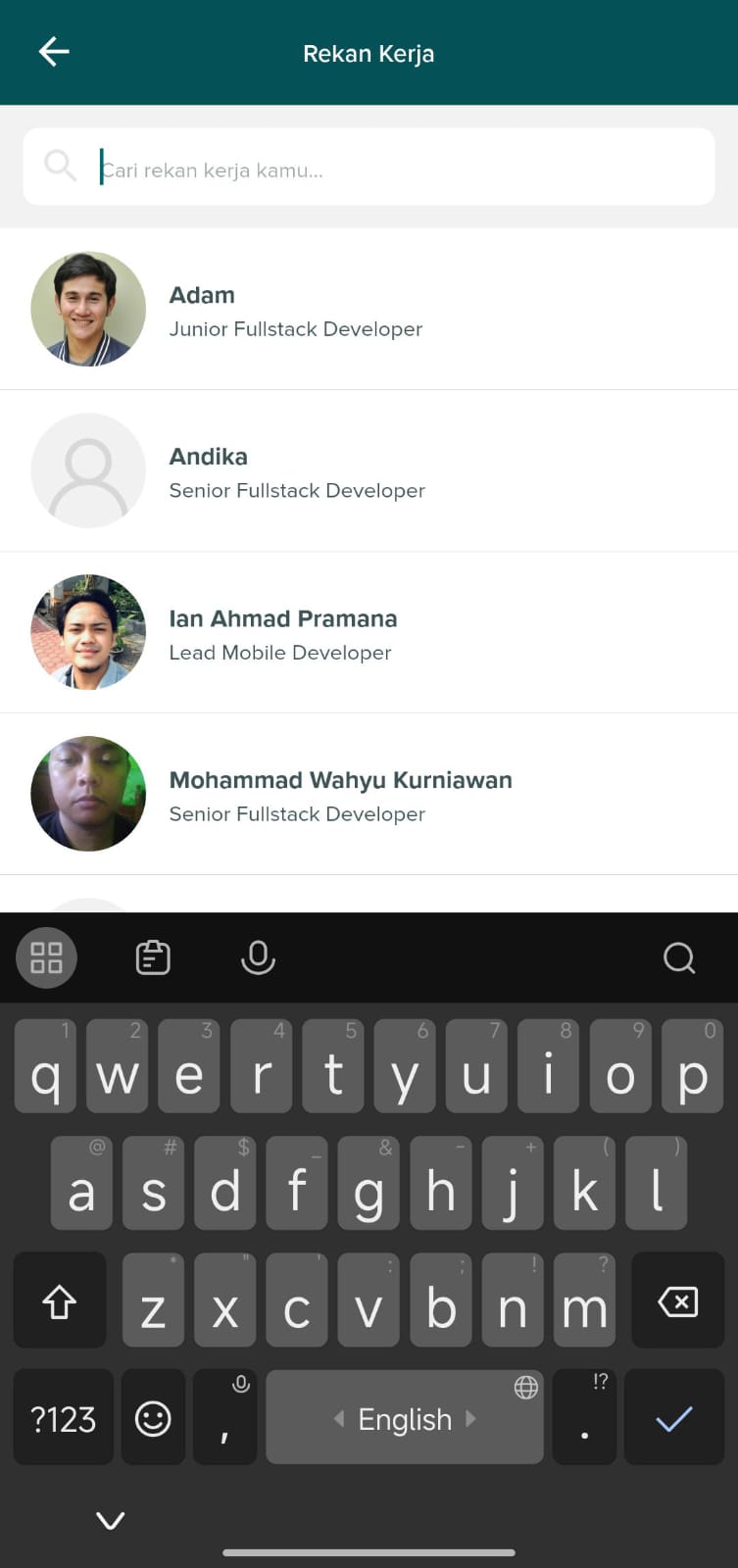 Tampilan fitur search untuk mencari rekan kerja berdasarkan nama atau kategori tertentu.