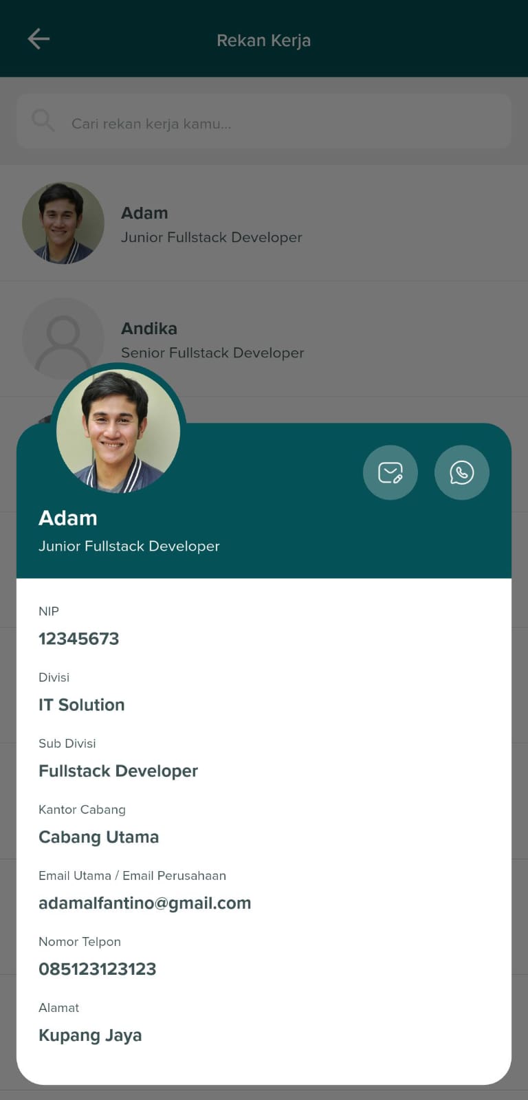 Tampilan detail profil rekan kerja dengan informasi lengkap dan kontak yang dapat dihubungi.