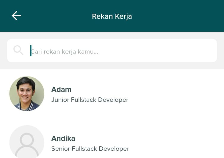 Pada tampilan ini terdapat daftar rekan kerja di perusahaan Anda, di mana Anda dapat melihat profil serta kontak yang bisa dihubungi.
