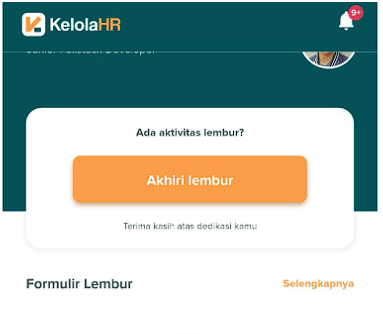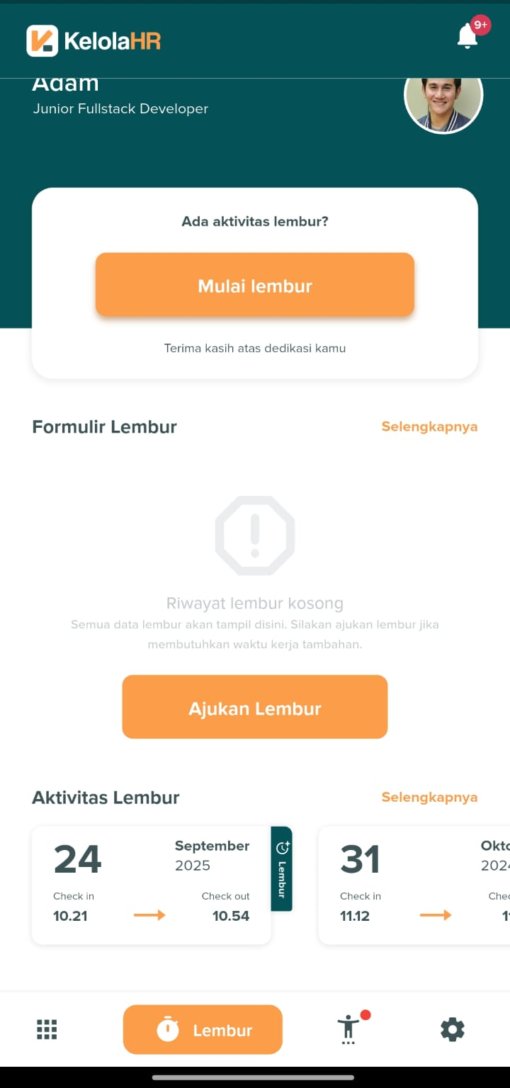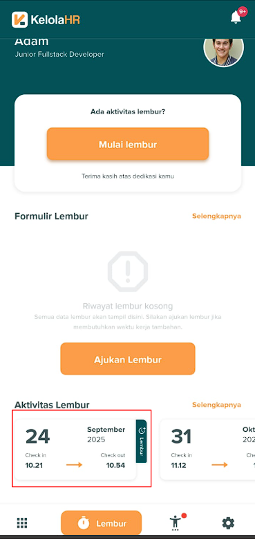 Pada tampilan Dashboard Lembur di aplikasi KelolaHR, terdapat bagian Ada aktivitas lembur?. Klik tombol Mulai lembur untuk mulai melakukan lembur.