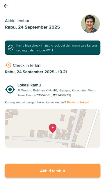 Fitur lembur mendukung mode WFH yang memungkinkan check in dan check out dari mana saja.
