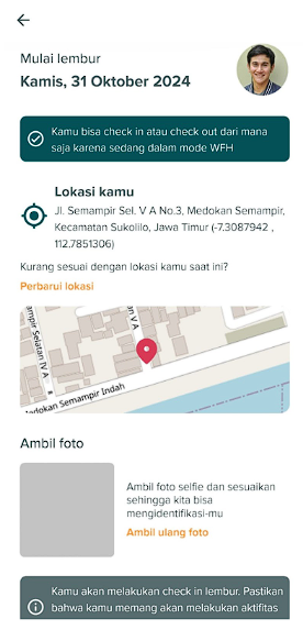 Setelah selfie berhasil diambil, tampilan akan kembali ke halaman Mulai Lembur. Data lokasi serta foto selfie yang sebelumnya telah diinput akan muncul di halaman ini