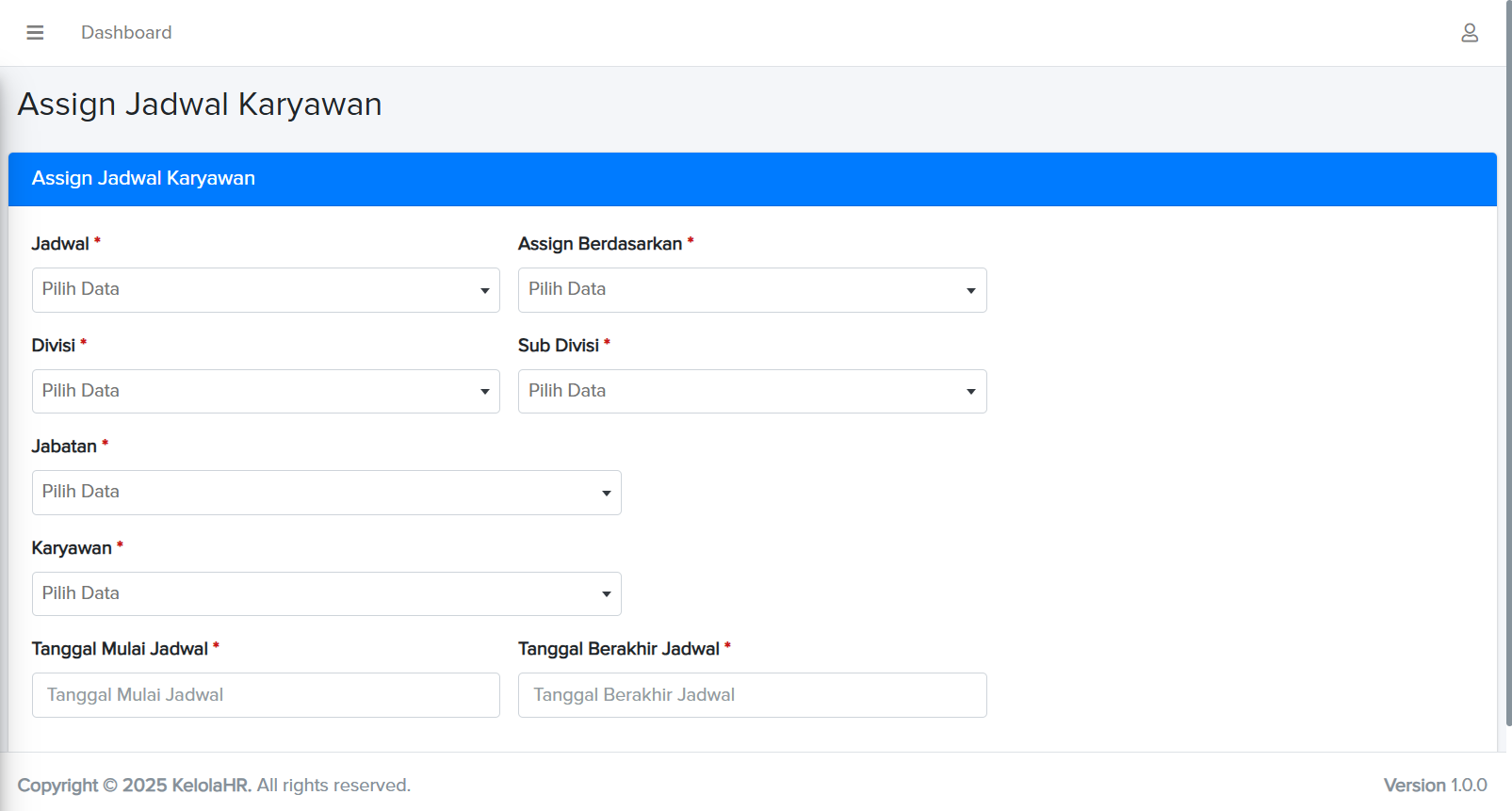 - • Assign Berdasarkan: pilih dasar penugasan jadwal (Divisi, Sub Divisi, Jabatan, atau Karyawan).
