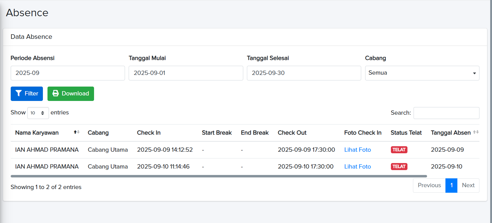 Data kehadiran karyawan akan muncul dalam tabel laporan sesuai periode dan cabang yang telah ditentukan.