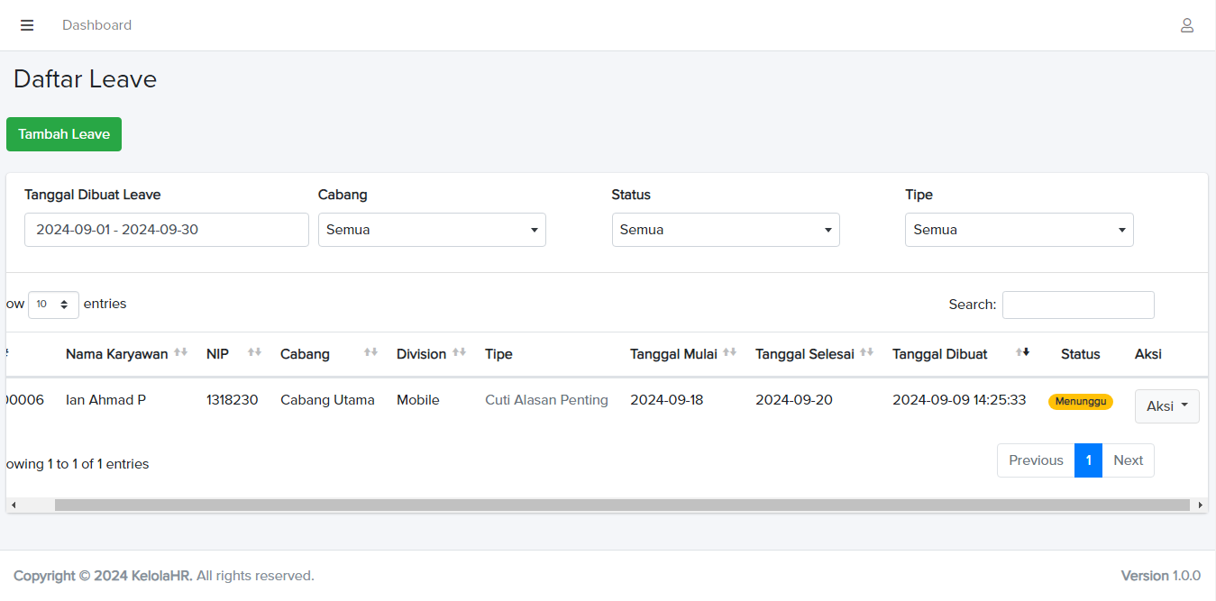 Data yang telah diinput akan otomatis masuk ke dalam tabel Daftar Leave pada dashboard utama.