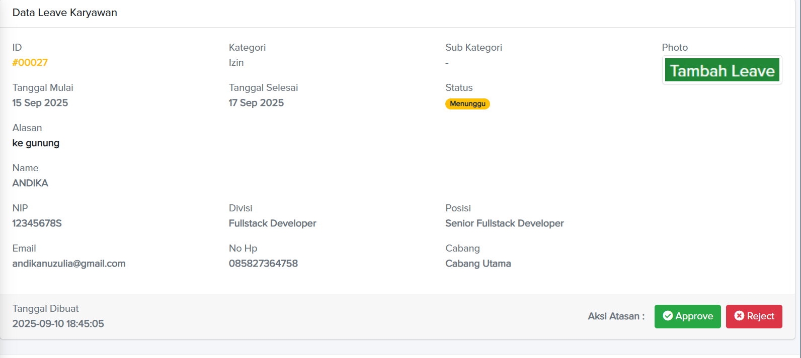 - • Klik tombol Reject untuk menolak pengajuan cuti.