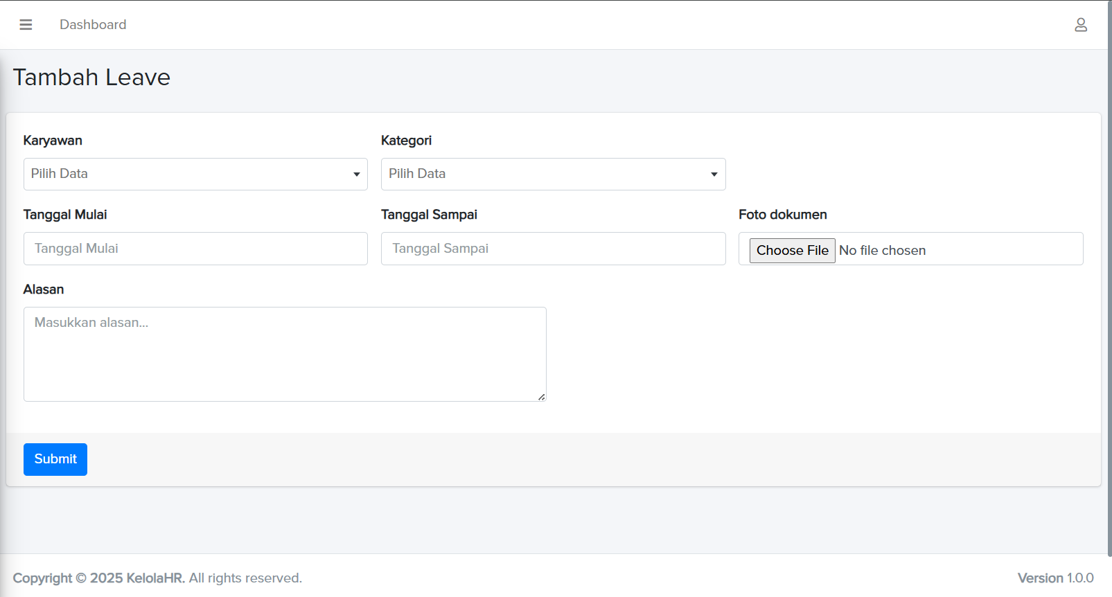 Berisi kolom input untuk karyawan, kategori cuti, tanggal cuti, alasan, dan upload dokumen pendukung.