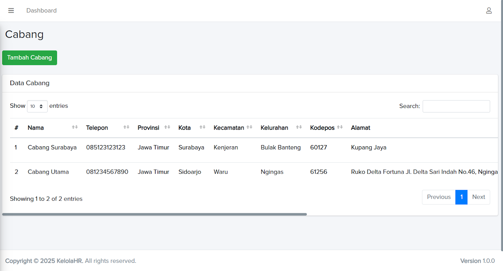 Search: fitur pencarian untuk mencari data cabang berdasarkan kata kunci tertentu.