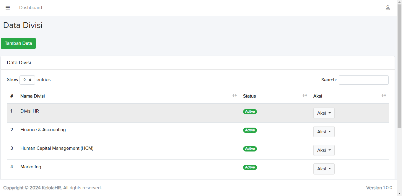 Active/Deactive: mengubah status aktif divisi (misalnya jika divisi sudah tidak beroperasi).