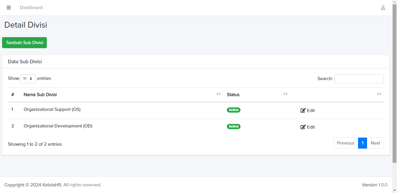 Menampilkan rincian subdivisi dalam satu divisi dan menyediakan tombol untuk menambah atau mengedit subdivisi.