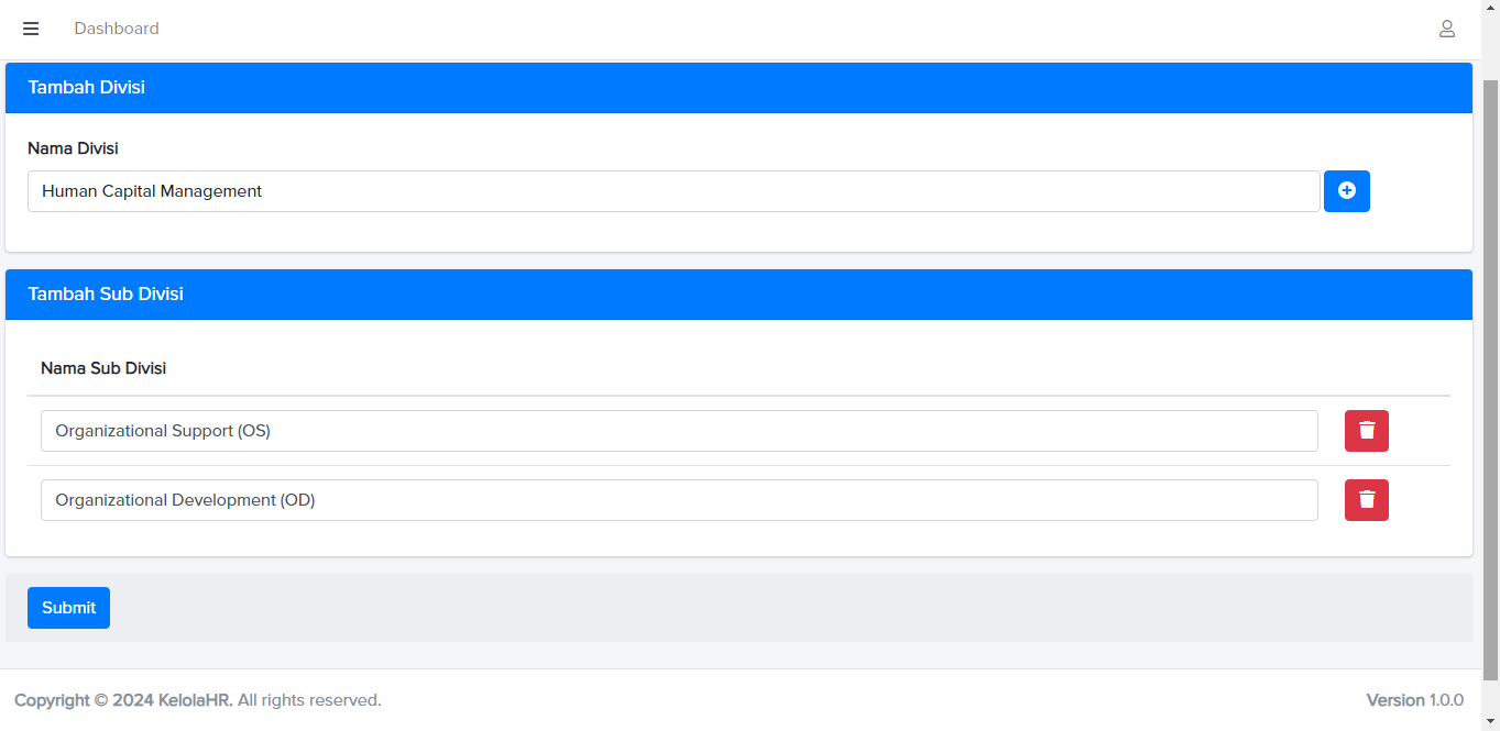 Menambahkan data divisi baru beserta rincian subdivisi yang dimiliki oleh masing-masing divisi.