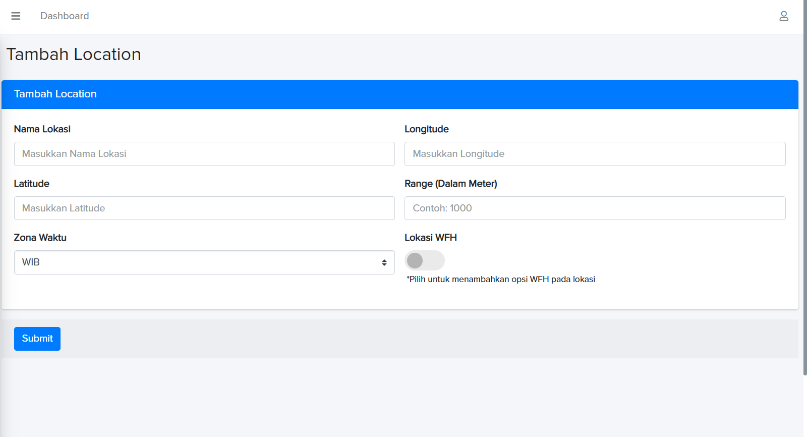 Merupakan Dashboard yang berguna untuk input data lokasi bekerja. Data ini memudahkan Anda untuk melakukan input lokasi tempat kerja karyawan, baik itu kantor pusat, kantor cabang, maupun karyawan yang statusnya WFH.