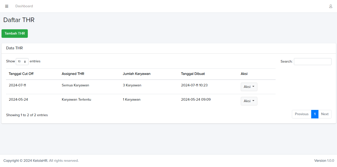 Dashboard ini menampilkan daftar seluruh data pengelolaan THR karyawan.