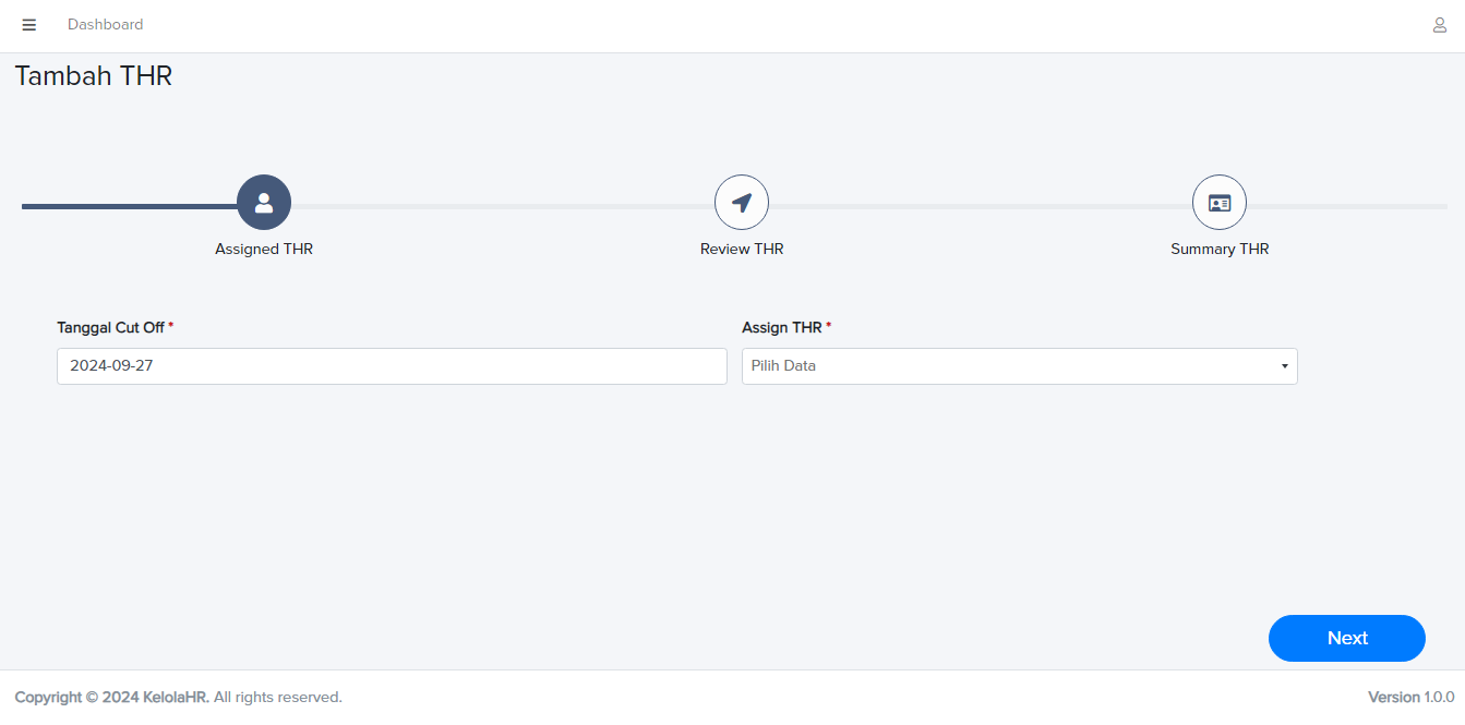 Akan muncul halaman Tambah THR dengan beberapa step pengisian, yaitu: