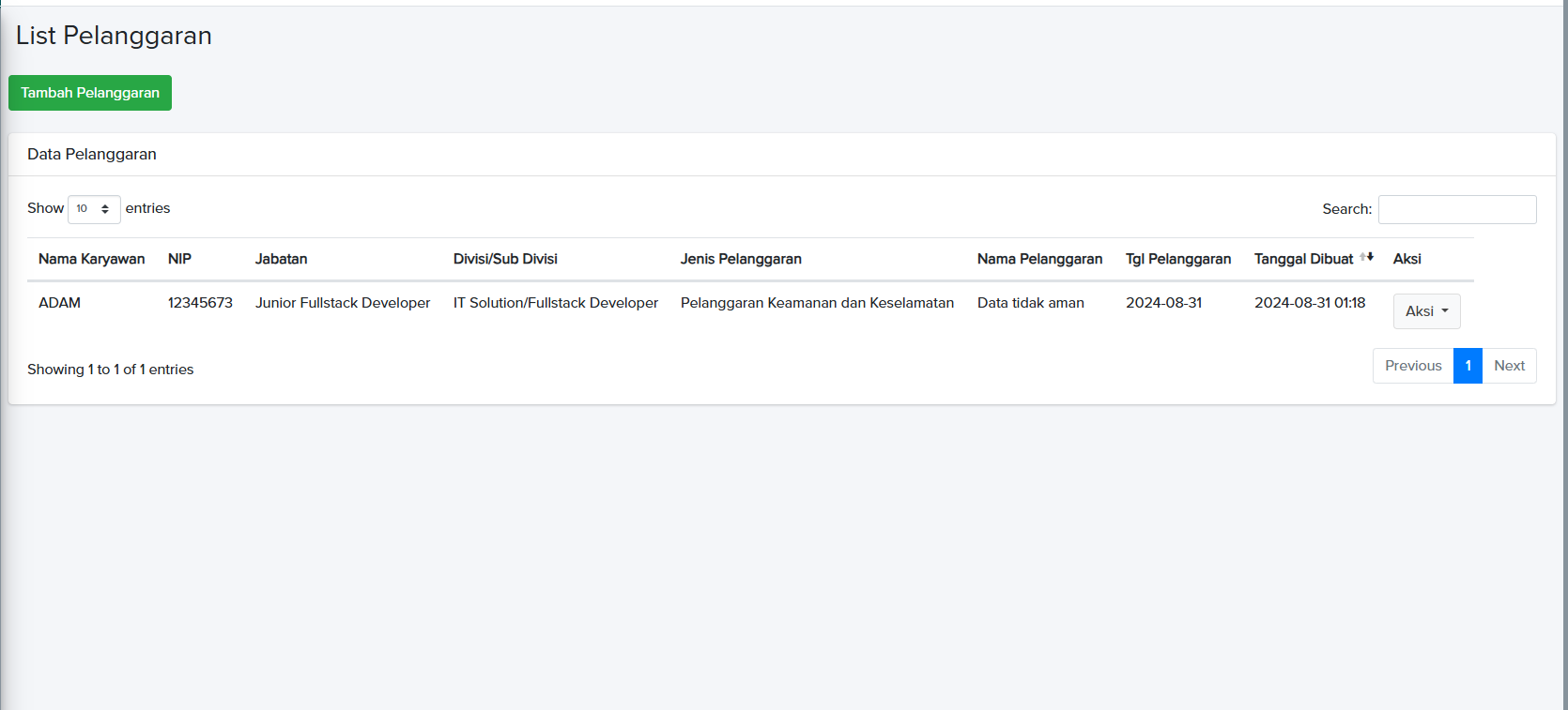 Klik tombol Tambah (+) pada dashboard List Pelanggaran.