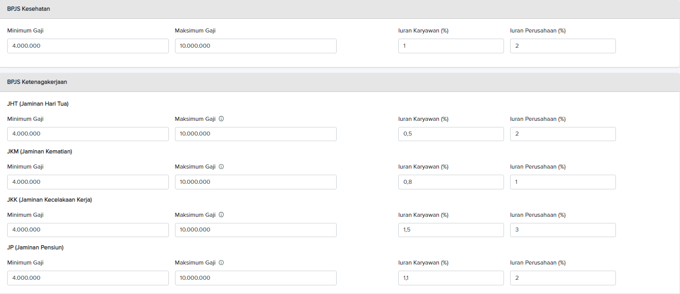 - • Pastikan data persentase iuran dan batas gaji mengikuti regulasi terbaru dari BPJS Kesehatan dan BPJS Ketenagakerjaan.