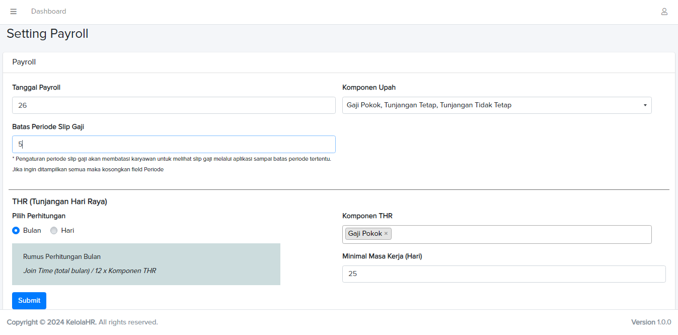 Fitur ini memungkinkan penyesuaian formula payroll sesuai kebutuhan perusahaan, termasuk pengaturan tanggal penggajian, komponen upah, dan perhitungan THR (Tunjangan Hari Raya).