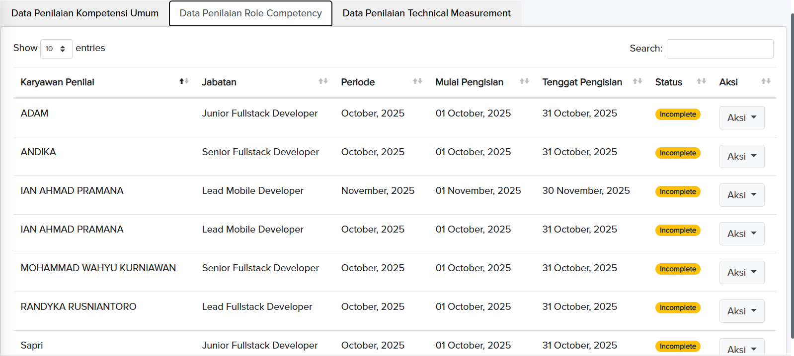 - • Data Penilaian Role Competence – Penilaian oleh atasan terhadap bawahan, berdasarkan Job Description dan tanggung jawab masing-masing.