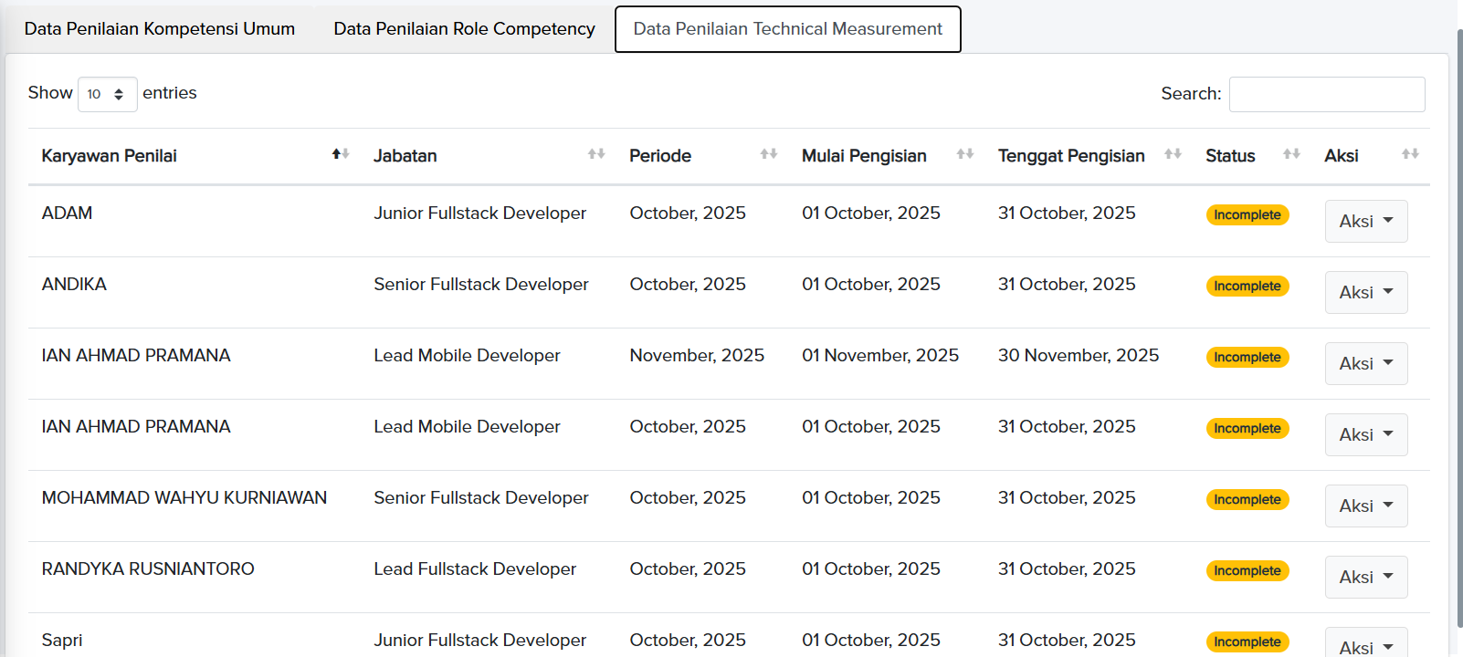 - • Data Penilaian Technical Measurement – Penilaian yang dilakukan oleh karyawan terhadap dirinya sendiri (self-assessment) berdasarkan keterampilan teknis sesuai jabatannya.