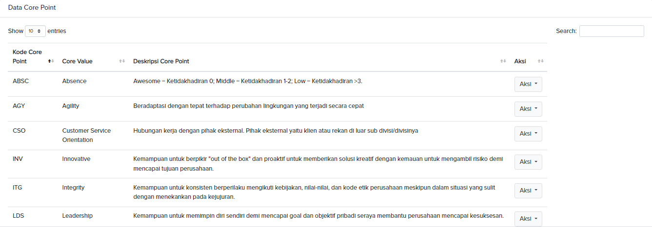 - • Tabel Data Core Point – berisi daftar core value dan deskripsi kompetensi inti perusahaan.