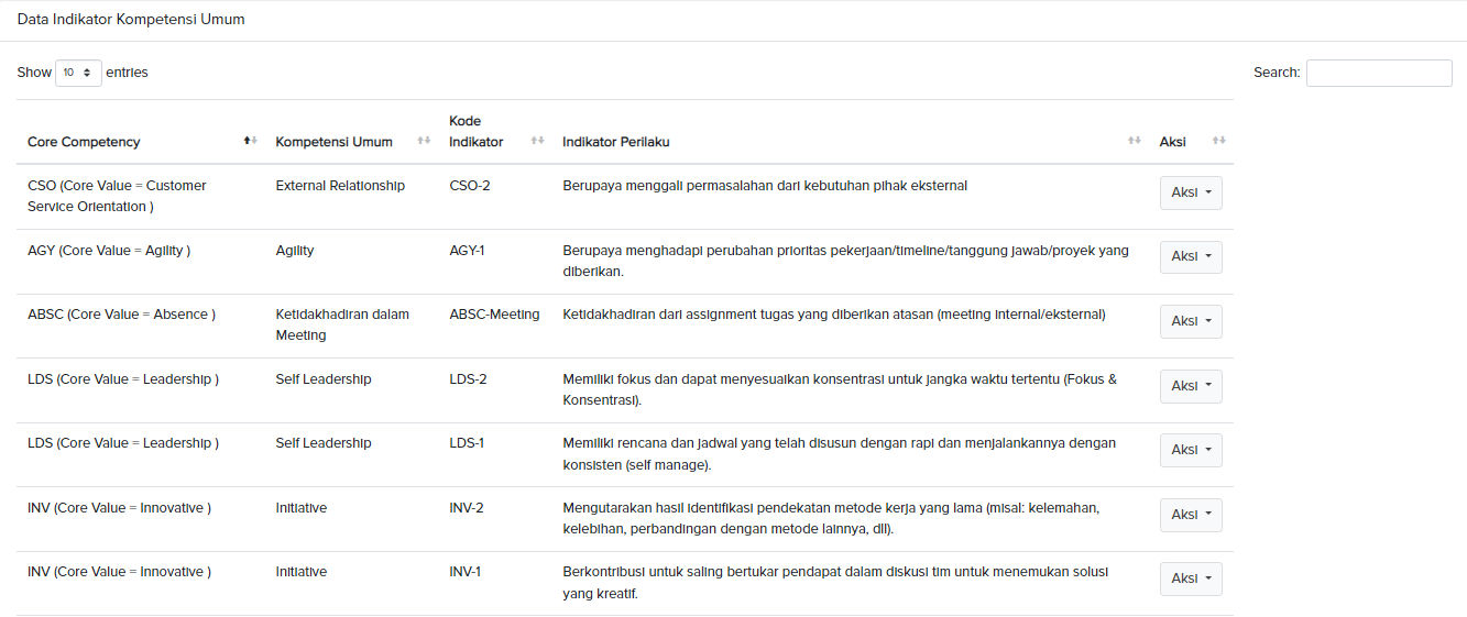 - • Tabel Data Kompetensi Umum – menampilkan jenis kompetensi umum yang dimiliki oleh masing-masing core point.